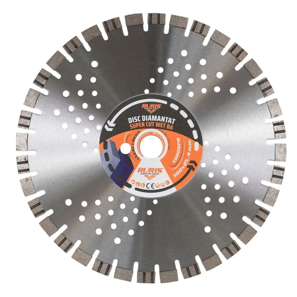 Disc diamantat RURIS Super CUT WET BA 300×25,4 pentru tăiere umedă în beton armat, diametru 300 mm, alezaj 25,4 mm, până la 5000 RPM, compatibil cu tăietoare beton RURIS RTX 600 și RTX 800, cod csba-300×25.4
