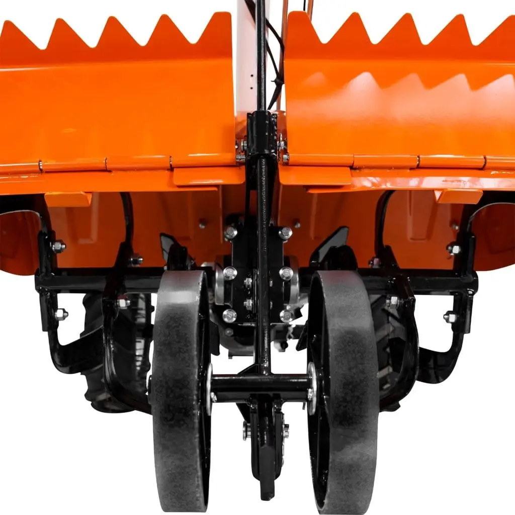 Acest model lucrează cu freze spate tractate și cu roți dedicate deplasării, configurație care aduce mai multă stabilitate în timpul lucrului și ajută la obținerea unei mărunțiri mai uniforme a solului. Pentru utilizator, acest sistem înseamnă manevrare mai clară, deplasare mai așezată și efort mai mic în exploatare, inclusiv în condiții de teren mai dificile.