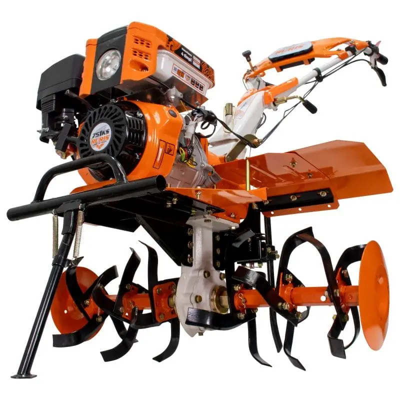 Motosăpătoare profesională RURIS 751KS Start, motor 9.5 CP, lățime reglabilă 640–900 mm, transmisie în baie de ulei, iluminare LED și compatibilitate cu multiple accesorii agricole.