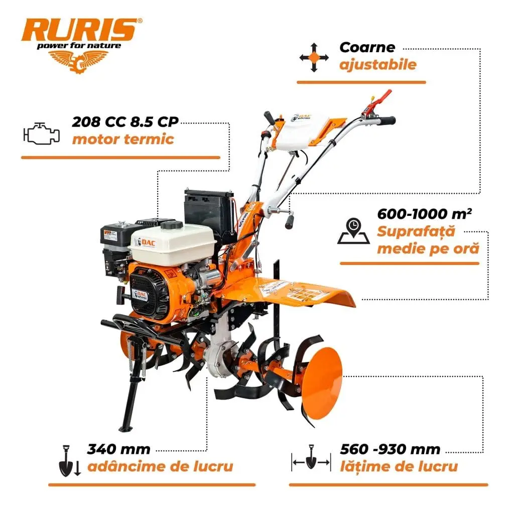 Motosăpătoare RURIS DAC 185 PRO, 8.5 CP, 208 cc, motor 4 timpi, pornire manuală și electrică la cheie, 2 viteze înainte + 1 înapoi
