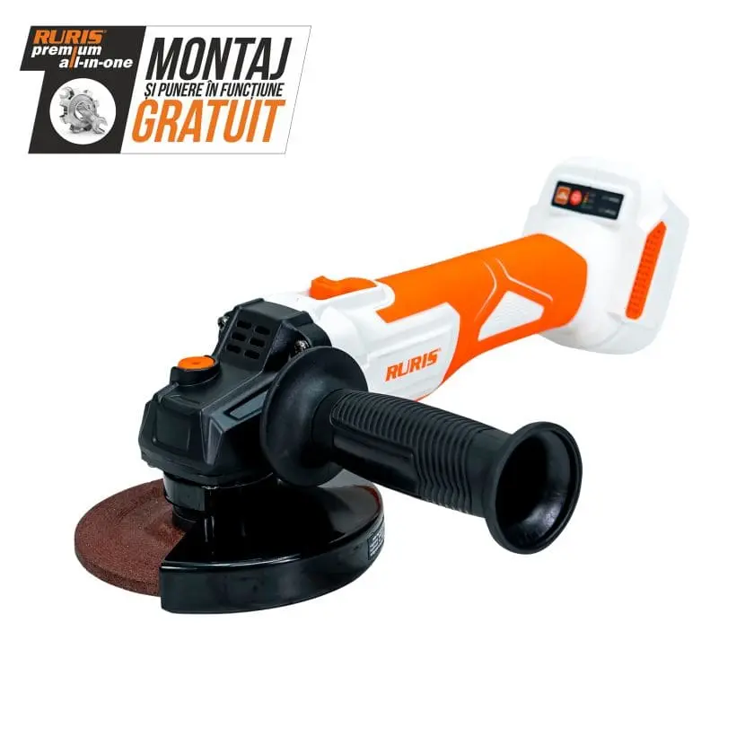 Polizor unghiular RURIS RMX4125 pe acumulator (neinclus), motor fără perii, 2 trepte viteză (2600/8500 rpm), diametru disc 125 mm, indicator nivel baterie, apărătoare reglabilă, mâner lateral cu 2 poziții, greutate 1.6 kg